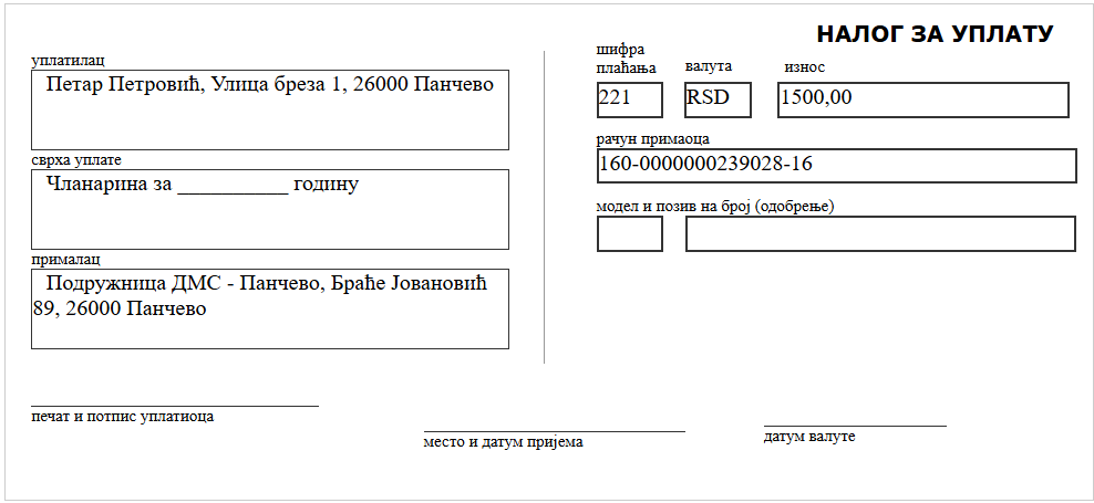 Да бисте уплатили чланарину попуните уплатницу као на уплатници на слици или скенирајте QR код.